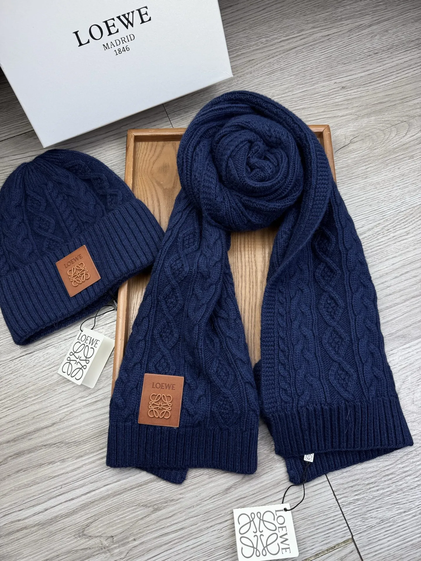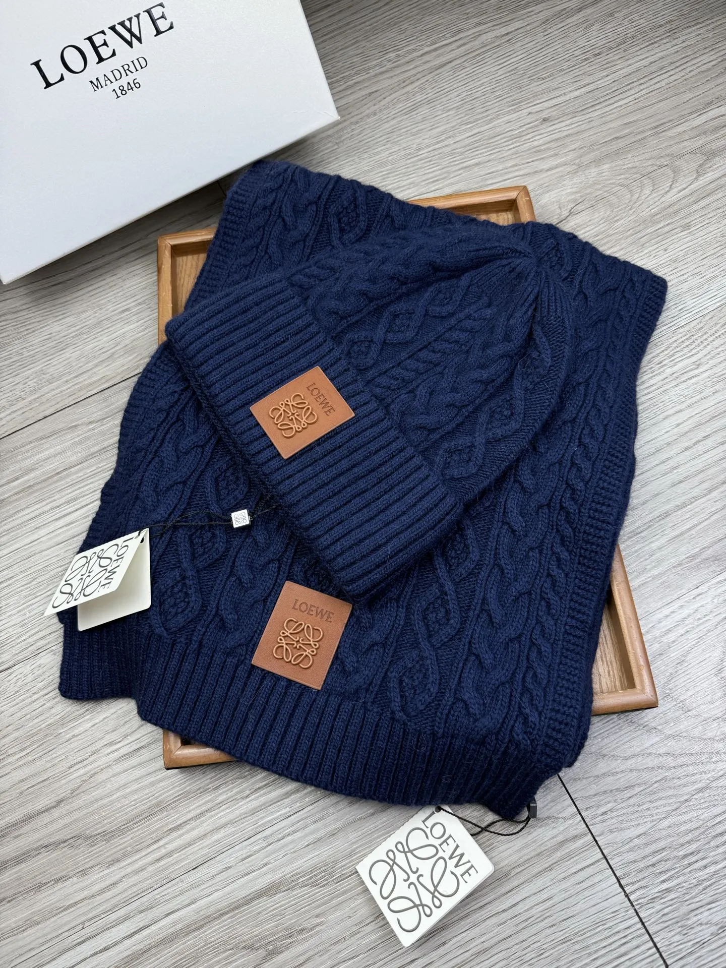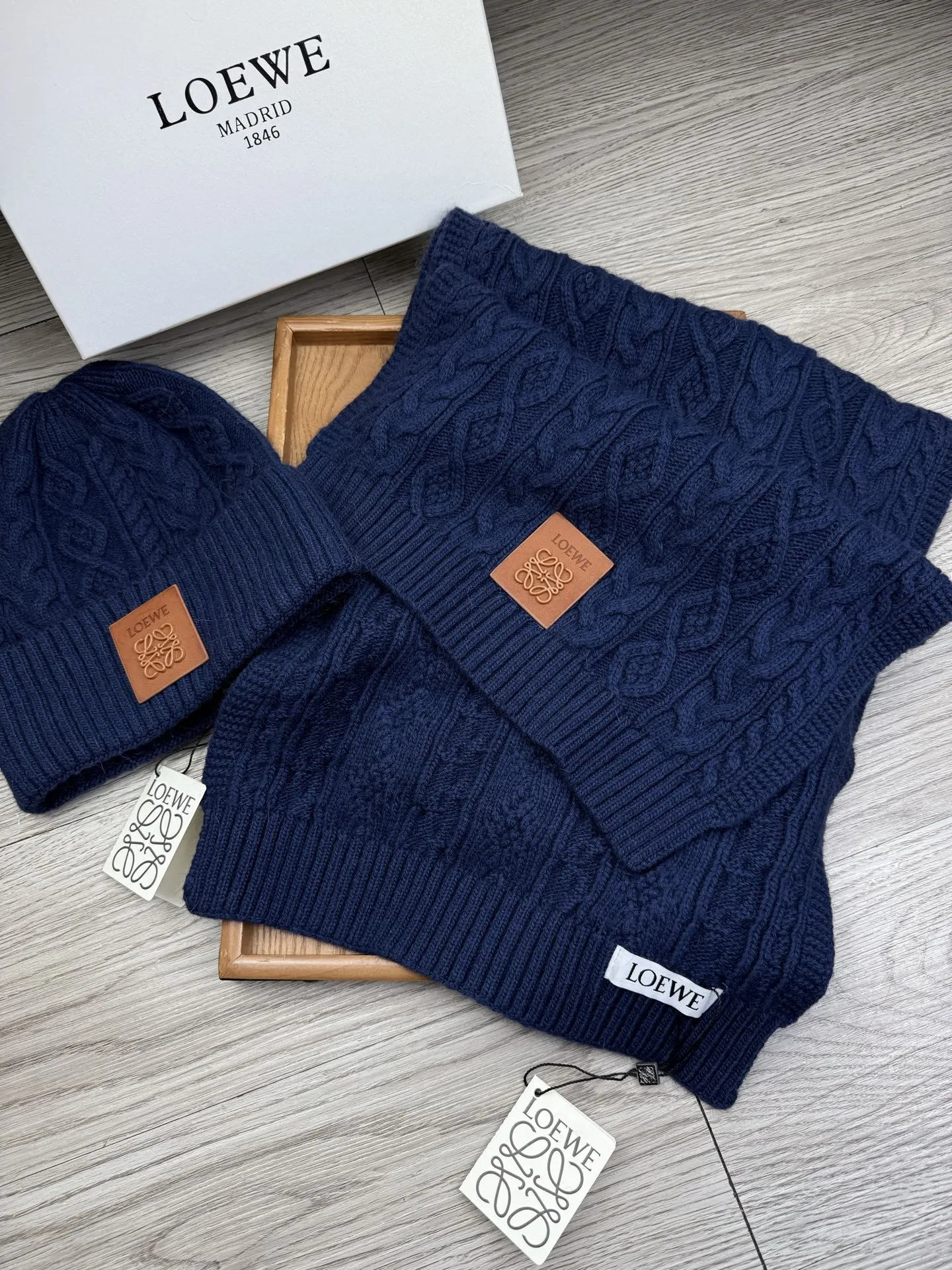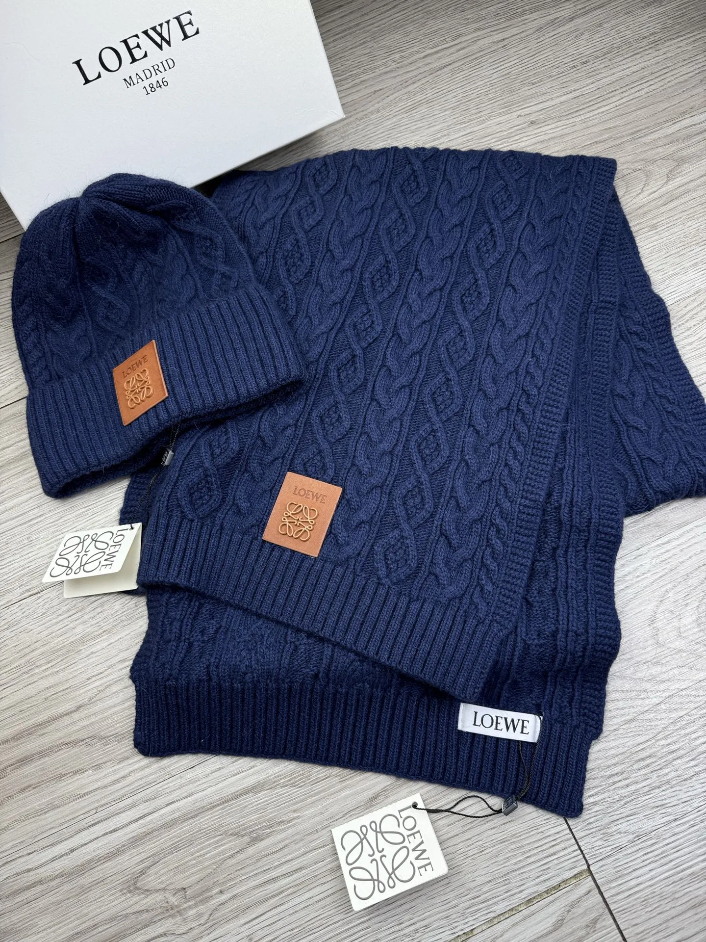 These LOEWE Hat and Scarf and Glove Set are very easy to resell due to the low costand fast shipping. Wholesale new arrivals cheap quality fake LOEWE Hat and Scarf and Glove Set enjoy free shipping and more discount with best quality! The hot on sale style LOEWE Hat and Scarf Set #1407596.