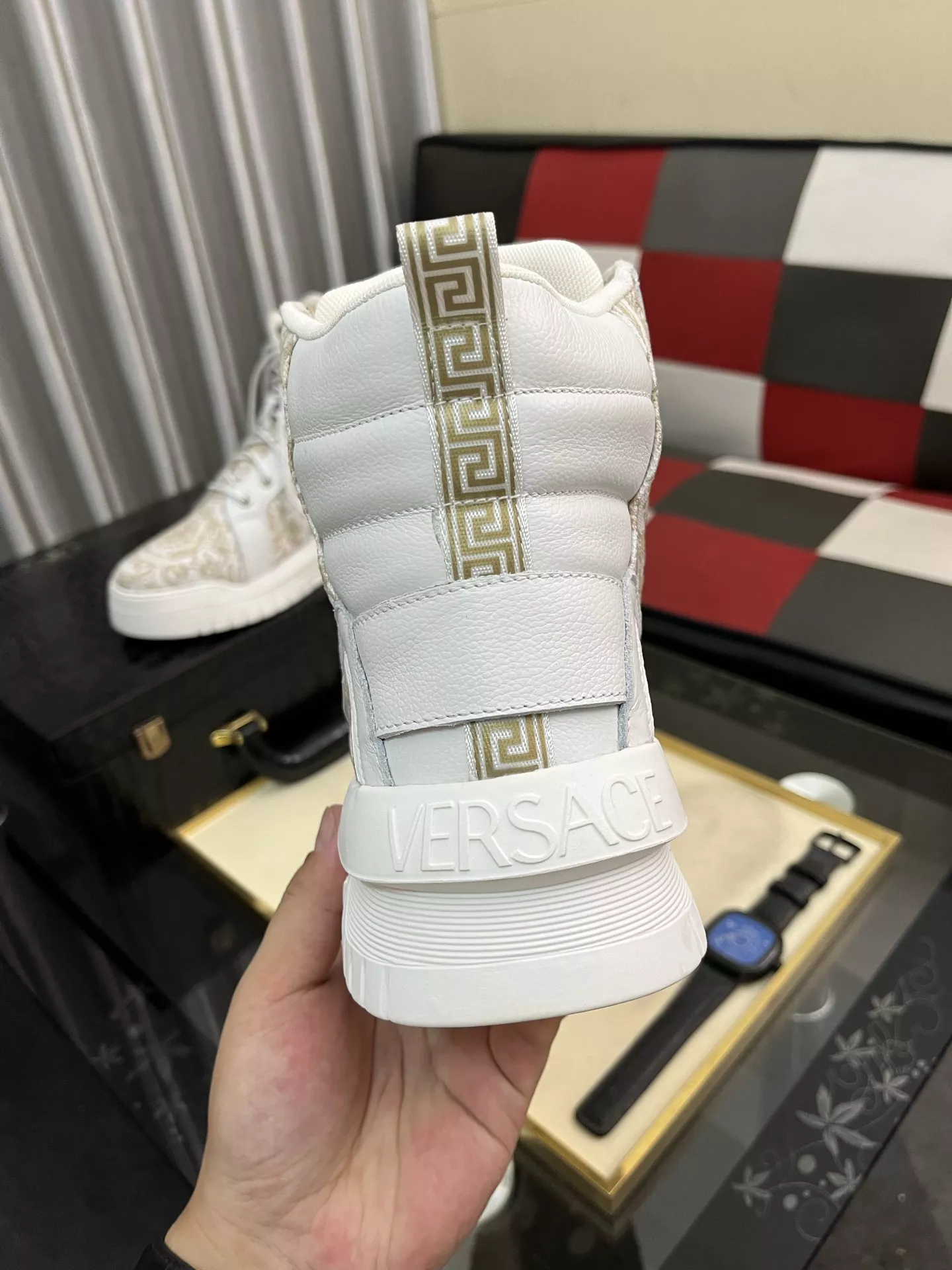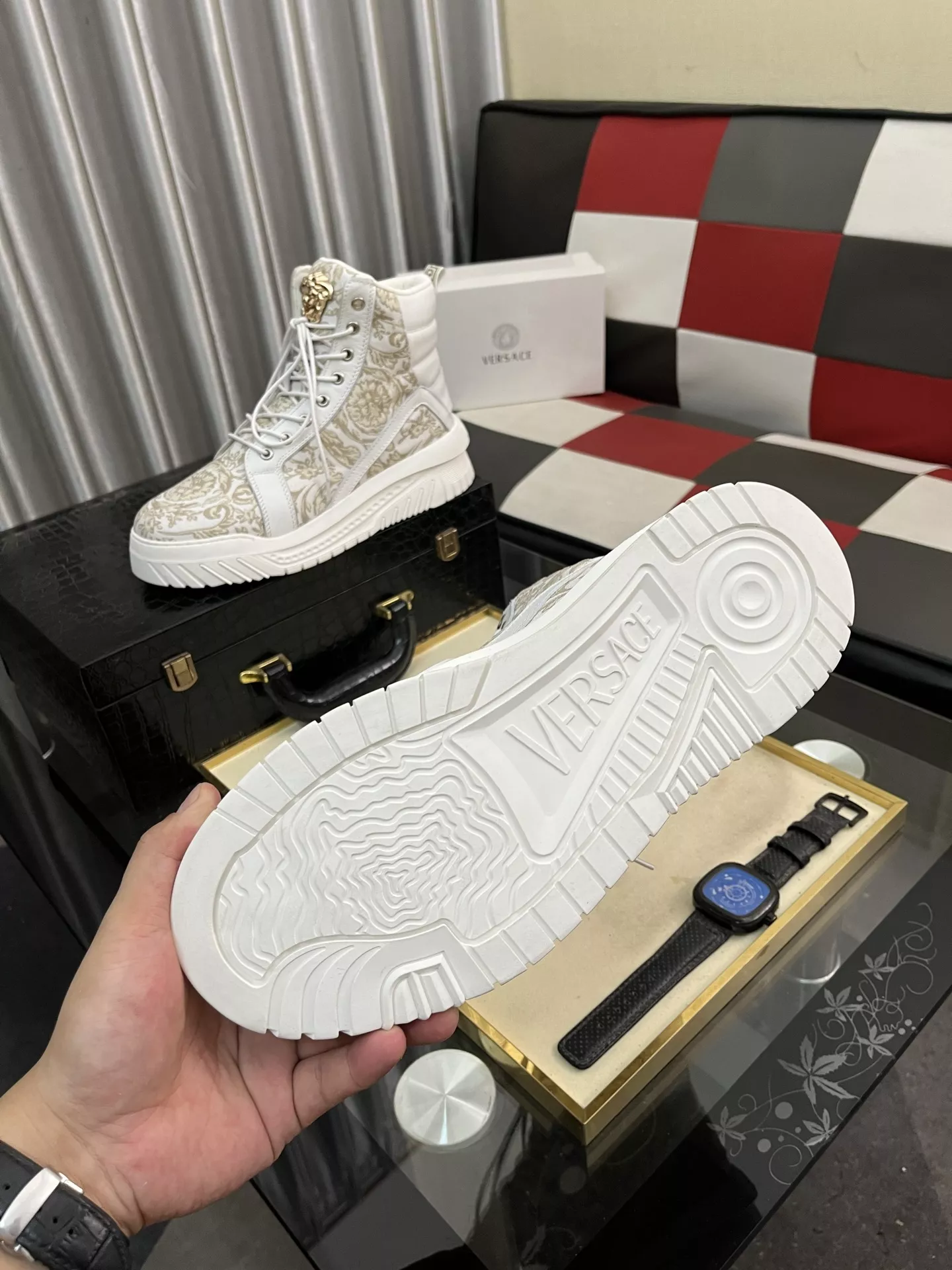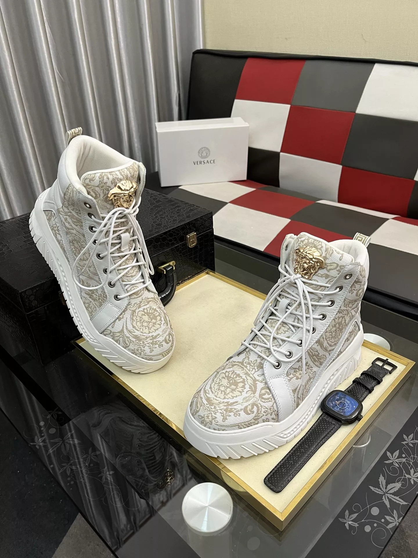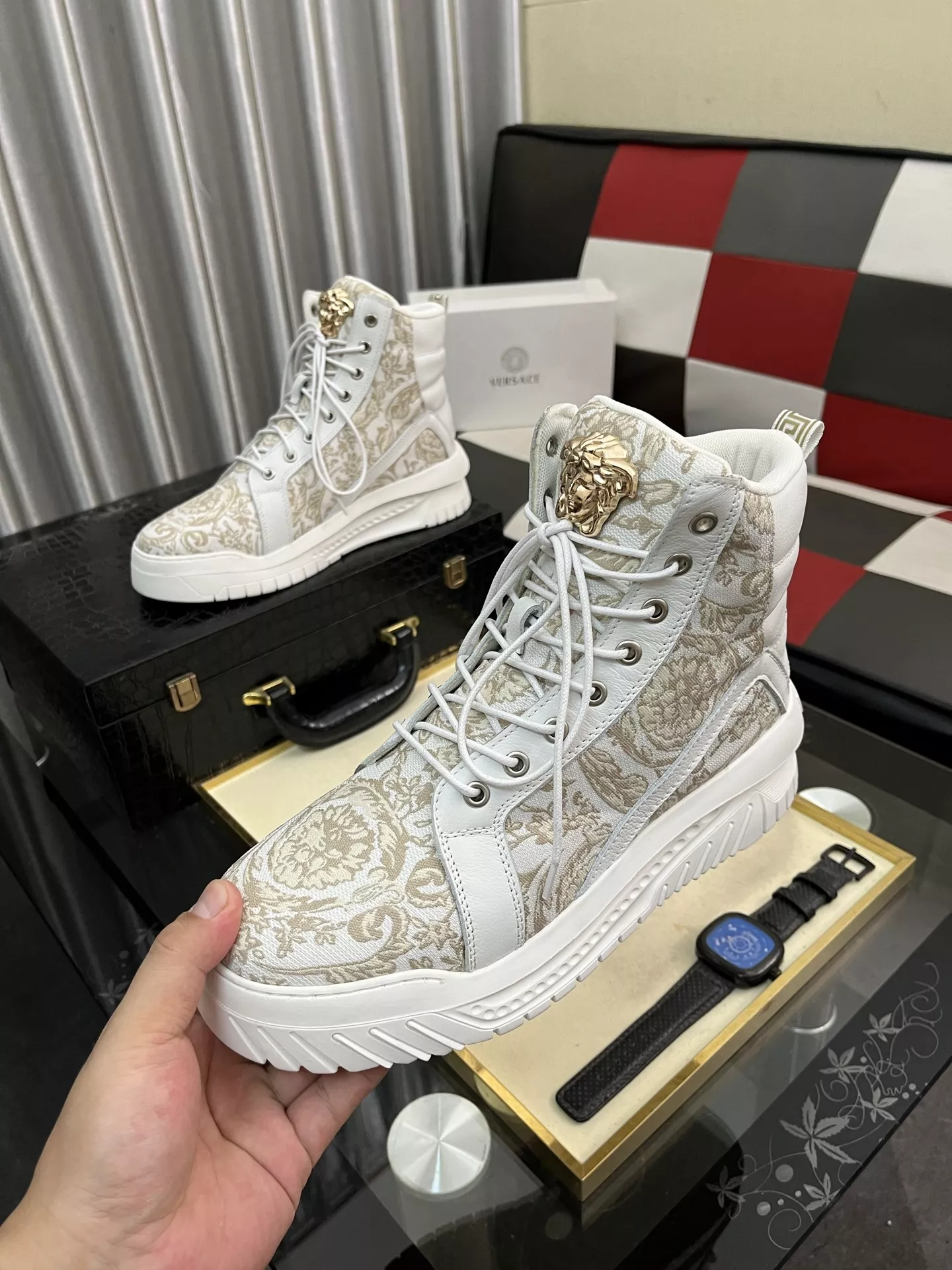These Versace High Tops Shoes are very easy to resell due to the low costand fast shipping. Wholesale new arrivals cheap quality fake Versace High Tops Shoes enjoy free shipping and more discount with best quality! The hot on sale style Versace High Tops Shoes For Men #1380515.