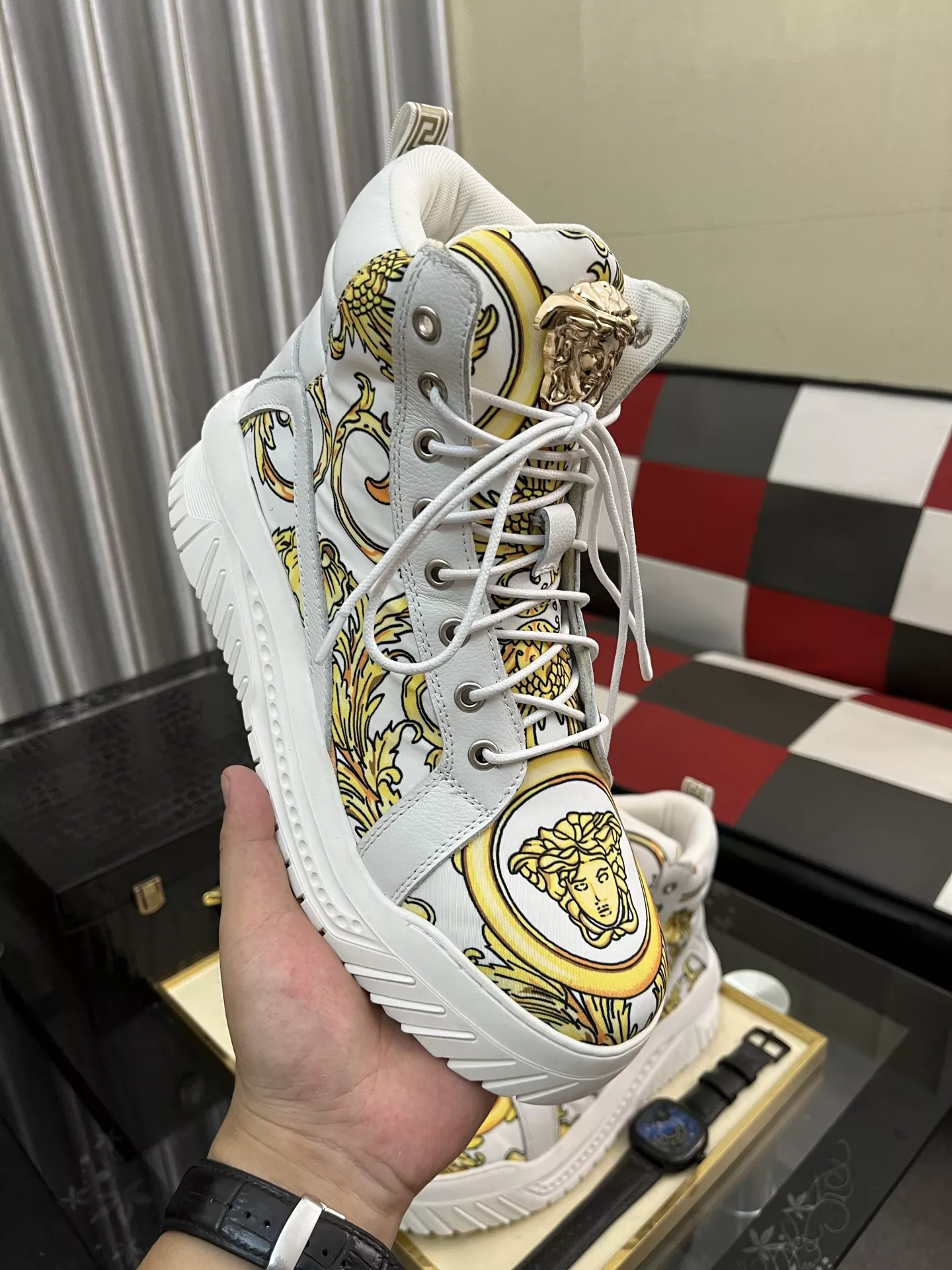 We also offer wholesale the best quality and cheap replica Versace High Tops Shoes items Gender MenSize US 4=EUR(38), US 5=EUR(39), US 6=EUR(40), US 7=EUR(41), US 8=EUR(42), US 9=EUR(43), US 10=EUR(44) online!