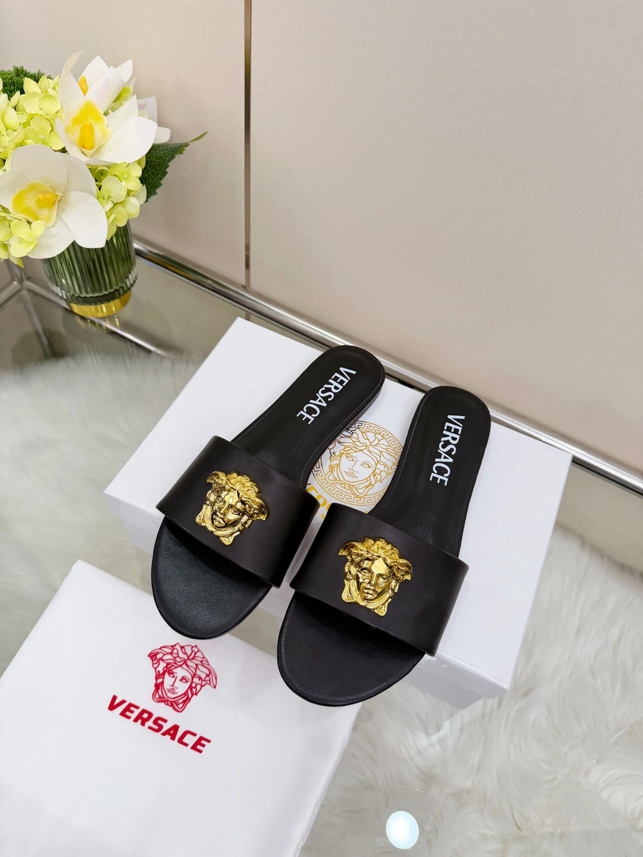 These Versace Slippers are very easy to resell due to the low costand fast shipping. Wholesale new arrivals cheap quality fake Versace Slippers enjoy free shipping and more discount with best quality! The hot on sale style Versace Slippers For Women #1432228.